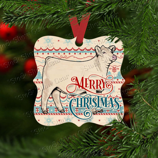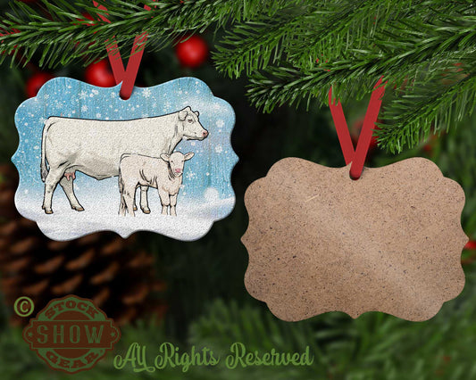Charolais Cow Calf-Snow Scene Wood Christmas Ornament