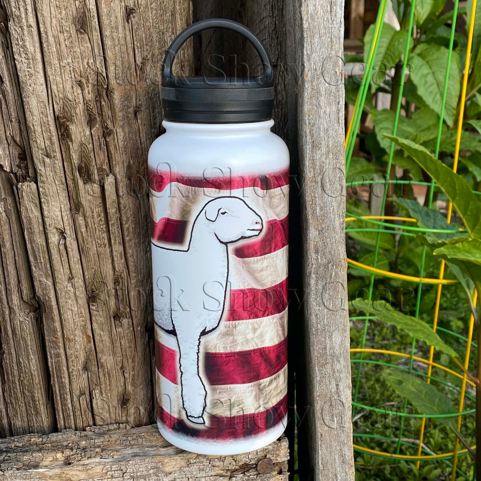 This is our "Purple Ribbon" Dorset graphic in white and she is a perfect fit on our "Wrinkled USA" print Water Canteen. Keep your drink cold and the barn dust out with either our straw top or the additional handle lid. Then go win the show!