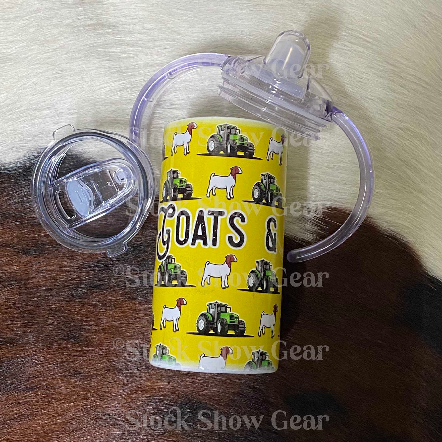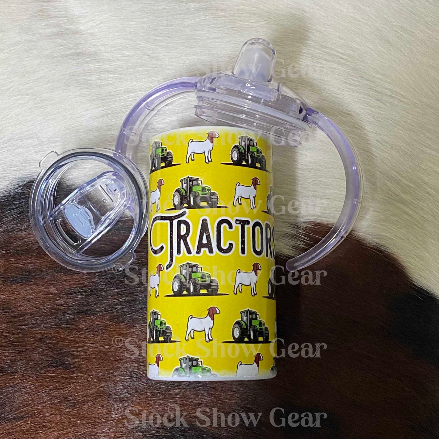 Your little one will love this sippy tumbler with lots of boer goats and tractors! What an idea - to have both of the favorite things all together on one item! The bright yellow keeps it easy to find and with the additional big-kid top, this could be a long-term investment!