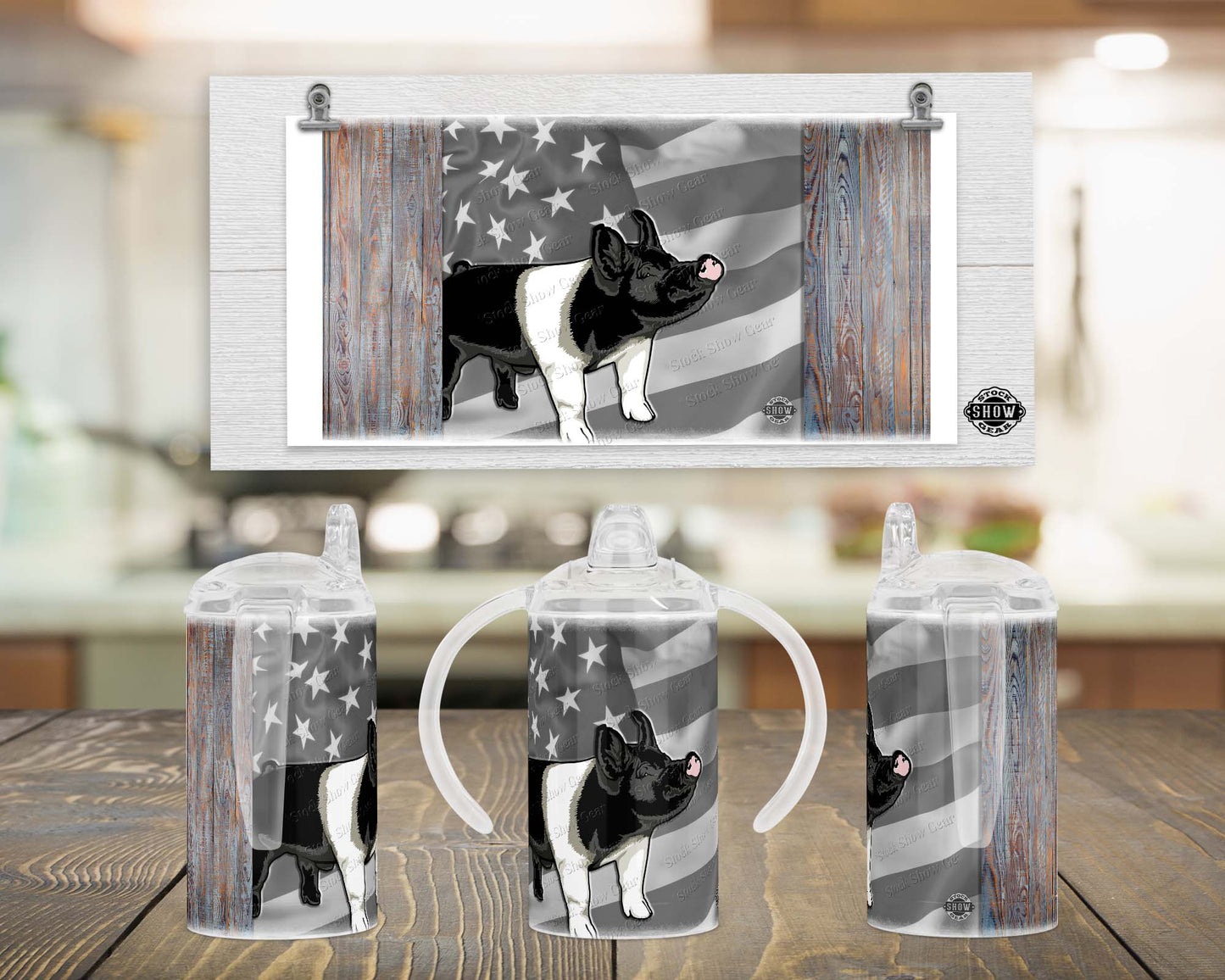 Stock Show Gear's Cross Show Pig Patriotic Sippy Tumblers and Youth Waterbottles feature our confident Cross Pig drawn by Robert Hollingsworth, for the little ones.