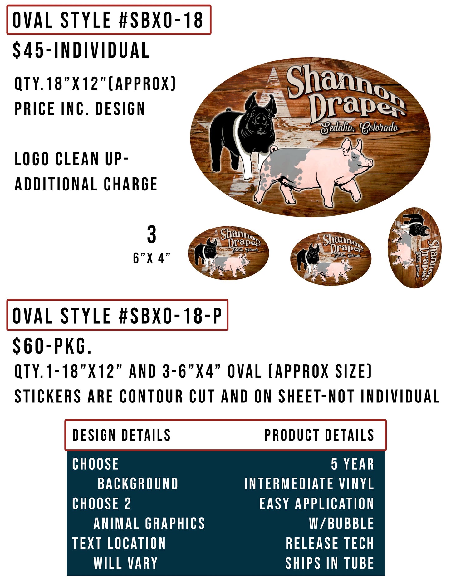 - Package Option decals may be oval or rectangle and come on a full sheet for customer to cut apart-CONTACT US FOR PRICING
